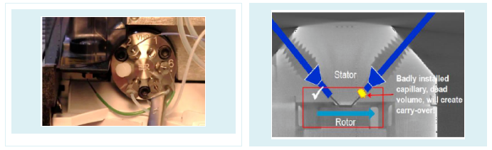 进样阀,也就是我们常说的六通阀(下图左),是自动进样器所有部件中十分重要的一个部件,若是使用维护不当,则经常会出现堵塞、漏液的异常。