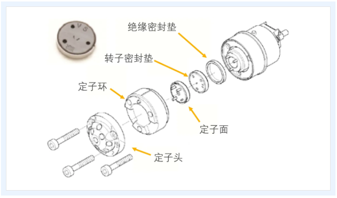 进样阀中转子密封垫磨损是经常导致色谱问题的原因之一。下图以常用的Agilent液相色谱系统自动进样器中的进样阀分解图和剖视图为例。