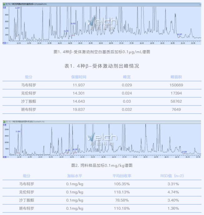 本篇月旭科技的固相萃取-气相色谱-质谱应用方案,在该色谱条件下进行测定,符合《农业部1063号公告-7-2008 饲料中8种β-受体激动剂的检测气相色谱-质谱法》的规定,可用于8种β-受体激动剂的检测。