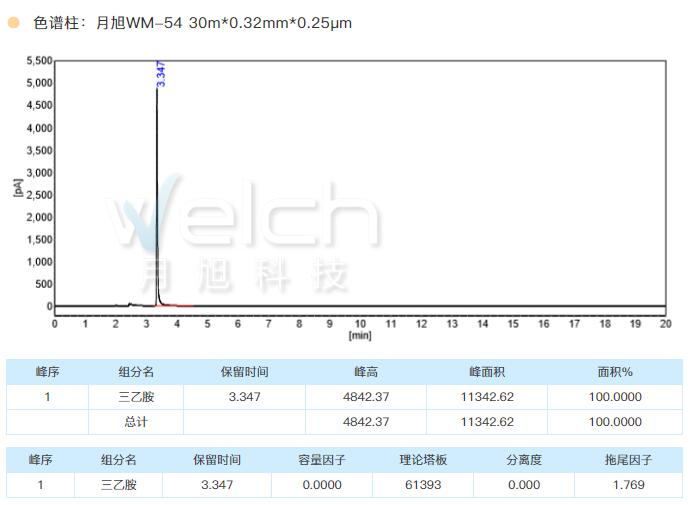 月旭科技胺改性柱WM 5-Amine 30m*0.32mm*1.0μm 检测三乙胺有很好的峰形和柱效。由于这一类物质在系统中也可能有残留,故仪器各部件也进行对应的清洗更换。