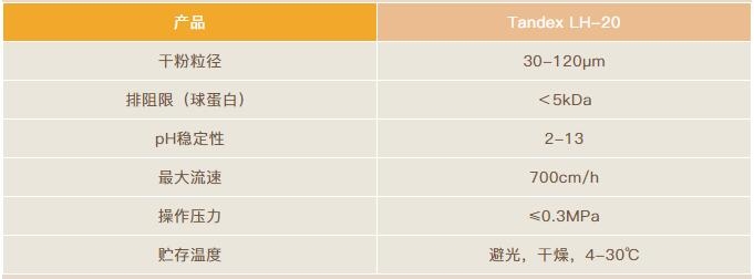 Tandex LH-20是在葡聚糖凝胶Tandex G-25的基础上经羟丙基化处理后得到的产物,不仅可在水中应用,也可在极性有机溶剂或他们与水组成的混合溶剂中膨润使用,适合中药有效成分的分离纯化以及抗生素和化学药物的精细纯化。