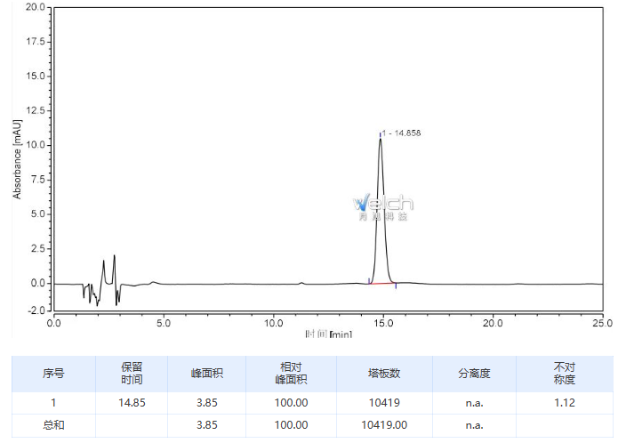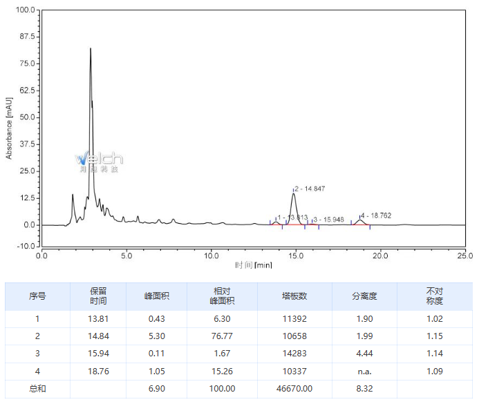 分析:此条件下分离度>1.5,杂质距离主峰较远。 4)使用同款色谱柱重现,效果图: 分析:柱间分离情况及保留时间有差异。 方案二 1)使用浓度99.5%的冰醋酸,条件为:甲醇:冰醋酸:水=78:0.3:22,柱温40,流速1mL/min,筛选更优柱子月旭Topsil® C18(4.6*250mm, 5μm),效果图: